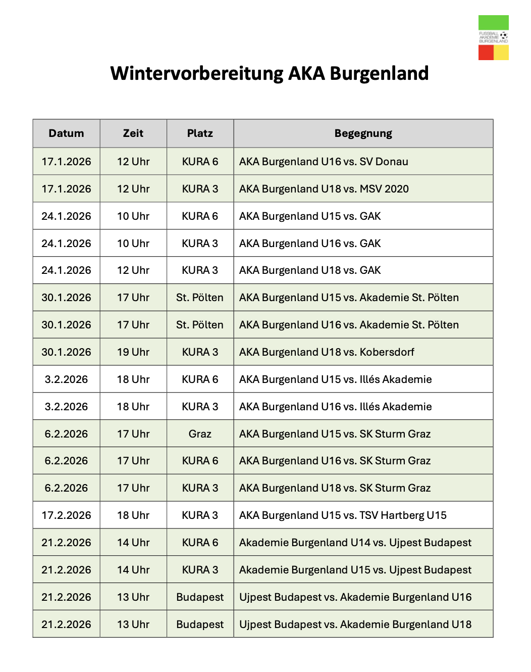 Der Testspielplan wurde bewusst vielseitig gestaltet. Neben regionalen Duellen warten Akademien und internationale Herausforderungen auf unsere Talente. Gegner wie der GAK, die Akademie St. Pölten, SK Sturm Graz, die Illés Akademie oder Újpest Budapest garantieren intensive Spiele auf hohem Niveau. Genau diese Vergleiche sind essenziell, um unsere Talente kontinuierlich weiterzuentwickeln und auf die Rückrunde vorzubereiten.